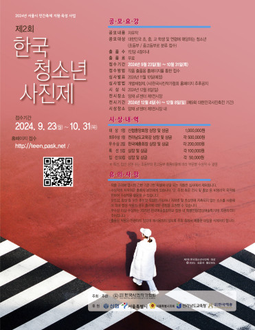 사단법인 한국사진작가협회(이사장 유수찬)가 주최·주관하고 신협중앙회, 서울특별시, 서울특별시의회, 전라남도교육청, 한국예술문화단체총연합회가 후원하는 ‘제2회 한국청소년사진제’가 지난 9월 23일부터 작품 접수에 들어간 가운데 오는 10월 31일 도착분에 한해 접수를 마감한다.