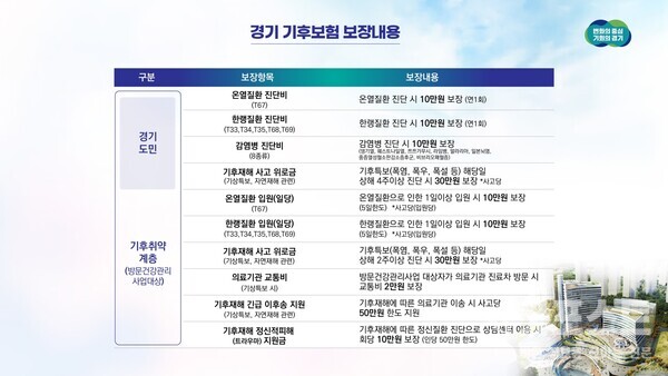 기후 취약계층(시·군 보건소 방문건강관리사업 대상자) 16만여 명에게는 일반 보장항목 외에도 온열질환 및 한랭질환 입원비, 기상특보 시 의료기관 교통비, 기후재해 시 구급차 이후송비, 정신적 피해 지원 등이 추가로 제공된다. 이를 통해 기후변화에 취약한 계층의 건강 불평등 문제를 완화하고, 더 두터운 안전망을 구축할 예정이다.