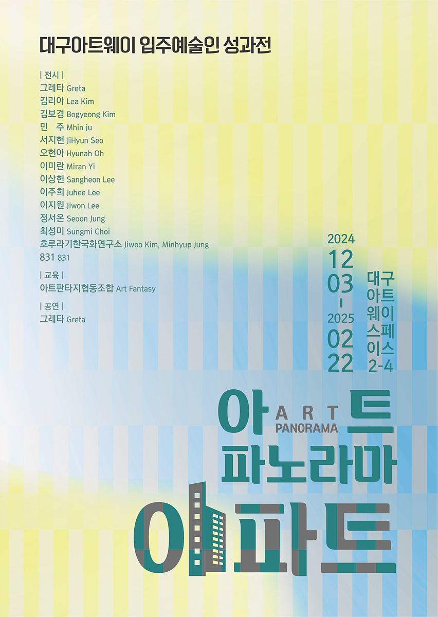 축제 기간 동안 ‘기획전시실’(스페이스 2~4)에서는 대구아트웨이 입주 예술인들의 성과를 한눈에 볼 수 있는 특별 전시 **‘아트 파노라마 아파트: APT’**가 열린다. 이번 전시는 2020년 대구아트웨이(구 범어아트스트리트)에서 진행된 입주 작가 교류전 이후 4년 만에 개최되어 그 의미를 더한다. 전시에는 입주 예술가들이 짧게는 1년에서 길게는 3년간의 창작 활동 결과물을 선보이며, 회화, 공예, 설치 등 다양한 장르의 작품을 만나볼 수 있다. 해당 전시는 이미 12월 3일(화) 시작됐으며, 2025년 2월 22일(토)까지 이어질 예정이다.