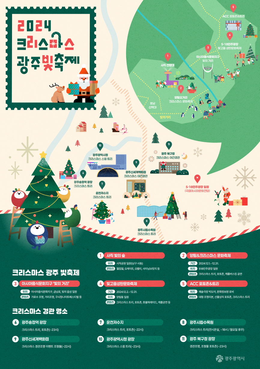 겨울밤 광주를 찬란하게 수놓을 ‘2024 크리스마스 광주 빛축제’가 시작됩니다. 광주광역시(시장 강기정)는 연말연시를 맞아 겨울철에 열리는 다양한 축제와 행사를 통합 브랜드화하여 빛의 도시 광주의 매력을 극대화하고 있습니다.