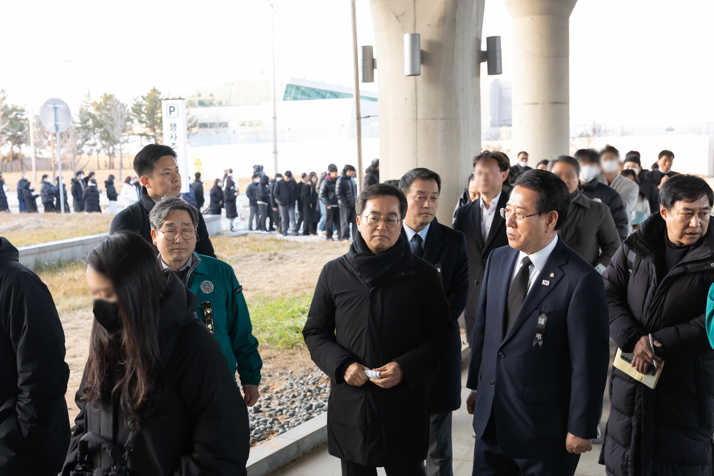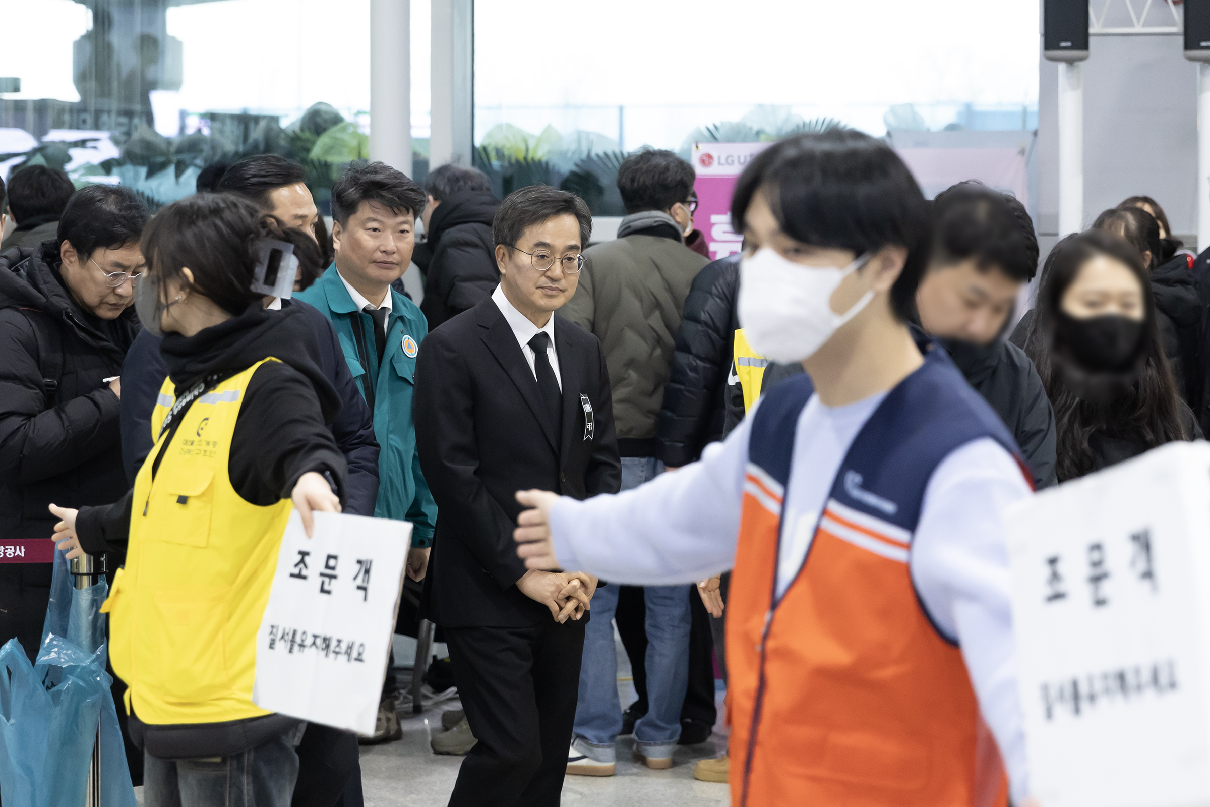 김 지사는 오후 4시 25분 무안공항에 도착했습니다. 하지만 그는 공항 내부로 바로 들어가지 않고, 조문객 행렬의 맨 끝을 찾아갔습니다. 신속하게 분향할 수 있는 인근 스포츠센터의 합동분향소가 있었음에도 불구하고 무안공항을 선택한 이유는, 시민들과 함께 하려는 그의 진심 어린 의지 때문이었습니다. 김 지사는 조문을 위해 줄을 서면서 시민들에게 “진심으로 조의를 표하고 싶다. 우리 마음이 그러니까...”라며 자신의 뜻을 전했습니다.
